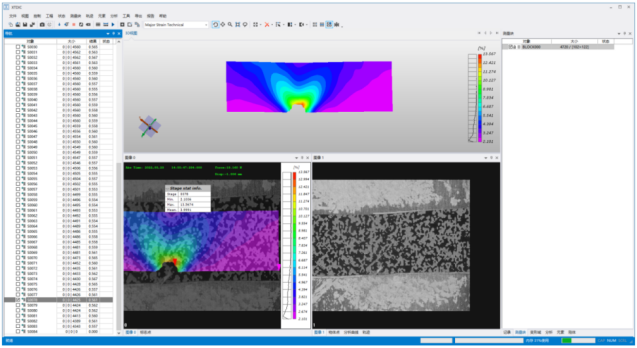 三维显微DIC应变测量在-20℃低温下高分子材料的拉伸过程。约20N材料出现断裂,测试系统很好的测量和反应了这个过程的应变分布由0.005%-13%。