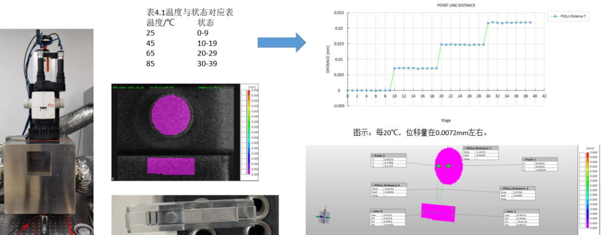 纤芯(2.5mm直径陶瓷棒)受金属条热膨胀三维全场变形位移测量;采用光学体式显微镜,结合温控箱等实现热胀冷缩中材料的相对位移(精度达到0.1μm左右)