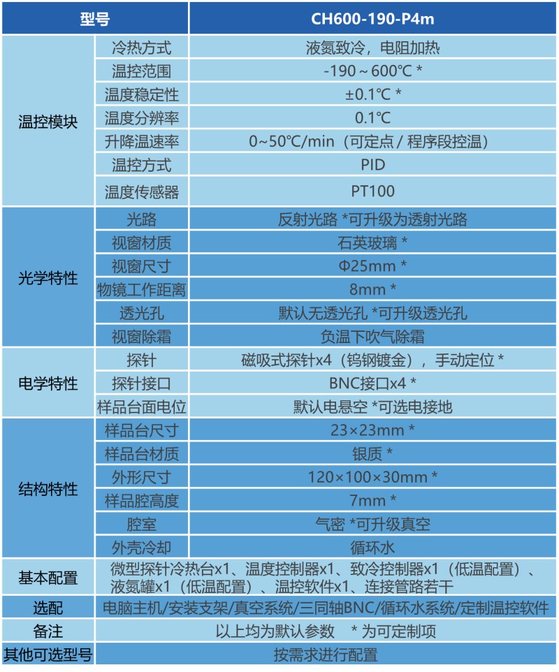 该产品采用液氮致冷、电阻加热的方式,实现样品台-190~600℃范围内精准控制,可与电学仪表(如源表、万用表等)搭配集成,进行变温原位测试。