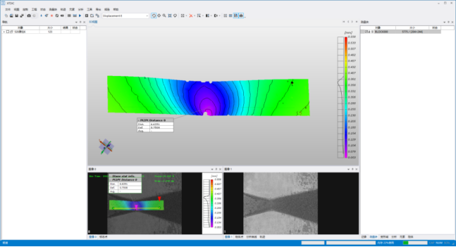 三维显微DIC应变测量在-20℃低温下高分子材料的拉伸过程。约20N材料出现断裂,测试系统很好的测量和反应了这个过程的应变分布由0.005%-13%。